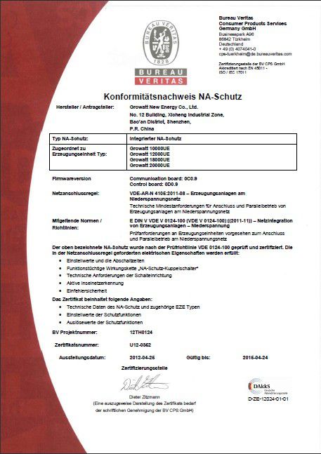 索比光伏网讯:记者从深圳发回消息,日前古瑞瓦特新能源Growatt10000UE、Growatt12000UE、Growatt13000UE、Growatt20000UE四款三相机型成功获得德国VDE-AR-N4105最新认证,再次为正在努力开拓的欧洲市场国内逆变器企业起到了表率作用。
