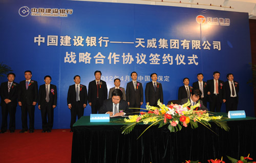 4月19日,天威集团与中国建设银行签署战略合作协议。中国兵装集团副总经理、党组成员、总会计师李守武,中国建设银行批发业务总监许会斌,保定市市长李谦,中国建设银行河北省分行行长李秀昆出席签约仪式。中国兵装集团总经理助理、天威集团副董事长、总经理、党委副书记丁强与中国建设银行集团客户部副总经理万志敏代表双方签约。中国建设银行河北分行副行长周小知主持签约仪式。中国兵装集团财务公司总经理王晓翔,中国兵装集团财务部副主任黄埔,保定市副市长刘宝玲,天威集团副总经理边海青、总会计师陈咏波,中国建设银行保定分行行长陈中新等参加签约仪式。