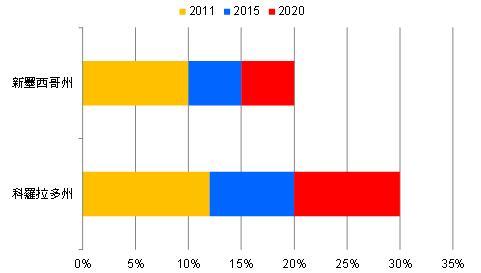 美国新墨西哥州及科罗拉多州蕴藏丰富天然资源,除了石油、矿产外,该地区太阳能日照时数为全美最高地区。新墨西哥州及科罗拉多州的气候温暖而干燥,全年平均降水量只有50公分。2010年以来,该区电力公司提供多元补助方案,带动太阳能发电系统开发案迅速增加,预计2012年新墨西哥州及科罗拉多州的太阳能发电系统装置量仍将持续成长。