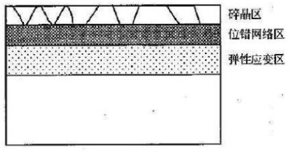 作为脆性材料,多晶大锭切方后,在小硅锭表面会有机械损伤层存在,包括碎晶区、位错网络区和弹性应变区,其结构如图1所示。碎晶区又称微裂纹区,是由破碎的硅晶粒组成的;位错网络区存在大量位错;弹性应变区则存在弹性应变,硅原子排列不规整。