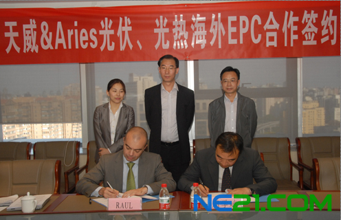 日前,天威新能源系统公司与西班牙ARIES公司签署合作协议。双方将充分发挥各自优势,在光伏项目市场开发、设计、采购、施工等领域资源互补,共同开发潜力巨大的市场并进行光伏电站的总包服务,促进互惠共赢。