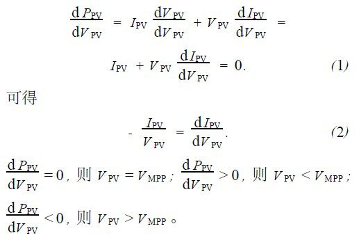 电导增量法通过比较光伏阵列的电导增量和瞬间电导来改变控制信号。由光伏阵列特性曲线可知最大功率点处满足电导条件[1,6]:
