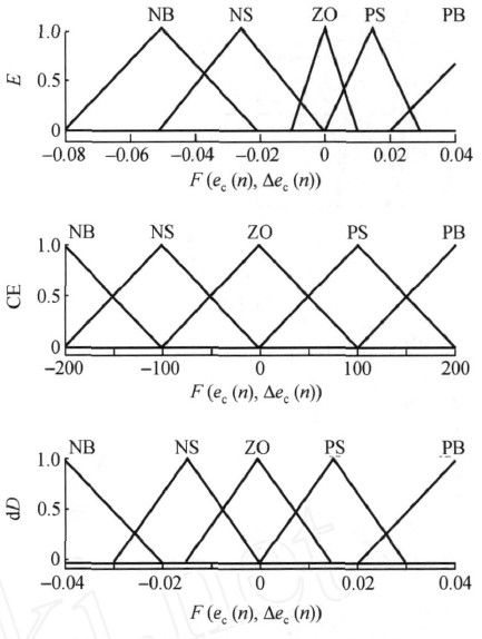 定义模糊控制规则为:若当前正向调节控制PWM占空比使输出功率增加,则继续正方向调整,反之则反方向调节,调节幅度由具体的模糊规则表和隶属度函数经模糊控制器输出决定。定义模糊集合:ZO=零PS=正小PB=正大NB=负大NS=负小。定义模糊函数F(ec(n),Δec(n))的输入输出隶属度函数E、CE、dD如图1所示。