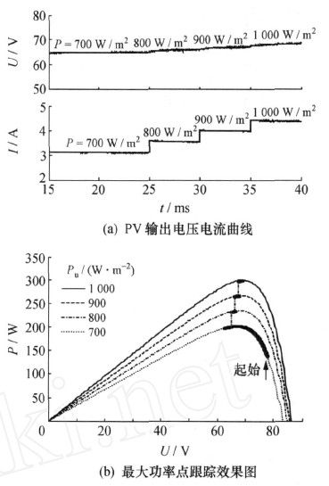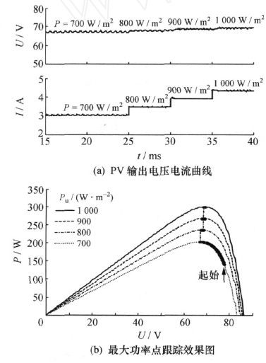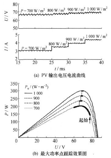 干扰观测法控制的MPPT仿真输出曲线如图3所示,图3a为光伏电池PV输出的电压、电流曲线,图3b为最大功率点跟踪效果图,系统从光照强度为700W/m2曲线右侧启动,显示在光照强度剧烈变化下的跟踪过程。