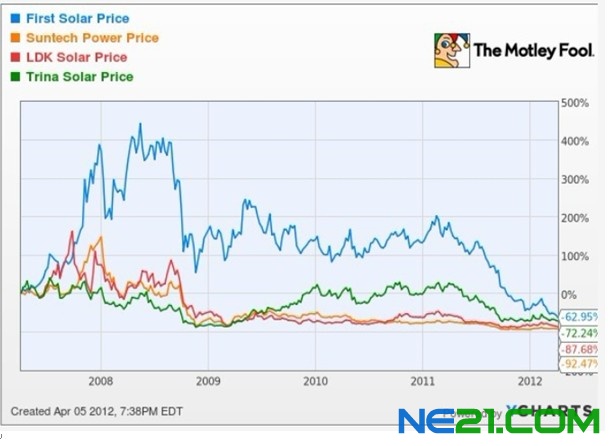 从光伏四巨头2008年到2012年4月5日的股价表现来研究,我们发现,起点一样,终点也差不多,但明显不同的是FirstSolar的市场收获要2倍于另外三家国内光伏企业,这里除了文化的差异影响外,更多的是产品独特技术的领先创新,确保了市场的持续优势并持续降低了产品成本(薄膜产品中做到了效率最高及成本最低),从而争取到定价主动权,而国内几家企业股价走势几乎是惊人的一致,因为缺乏差异,没有领先优势,以及产品同质化,只能被动实施成本竞争。