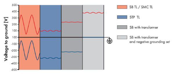以MPPT电压为400V、电网电压为230V(50Hz)和下列SMA的4个类型的逆变器为例,其对应的光伏阵列的输出端对地电压的情况如下图所示。