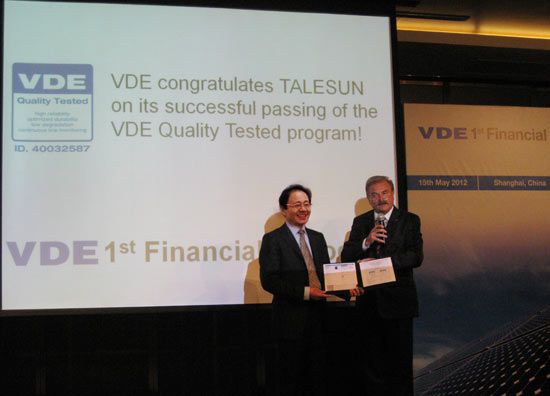 Zhongli Talesun was invited to participate VDE financial dialogue event in Shanghai which was held by VDE certification institute. During this event, VDE global president Mr. Wilfried Jager awarded the VDE Quality-tested certificate to Zhongli Talesun president Mr. Wang Bai Xing on his own, which signaling Zhongli Talesun becomes the first PV Company in China who receives the highly recognized quality certificate. Mr. Shi Dinghuai, Consultant of the State Council, and the president of China Renewable Energy Society, Mr. Han Qiang, General Manager of VDE Products testing(Shanghai) Co., Ltd., Mr. Wu Jianguo, the leader of National solar photovoltaic products quality supervision and Inspection Center, Mr. Wang Wei, the president of NARI Group Corporation, Mr. Sunil Gupta, Global President of Standard chartered Bank, Mr. Boris Farnung, research supervisor of Fraunhofer ISE PV product institute in Germany, Doctor Thomas Reindl, executing director of SERIS, Doctor Wang Shunquan of National solar photovoltaic products quality supervision and Inspection Center, Mr. Chen Jie, VP of Zhongli Talesun attended this event.