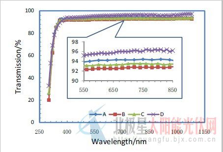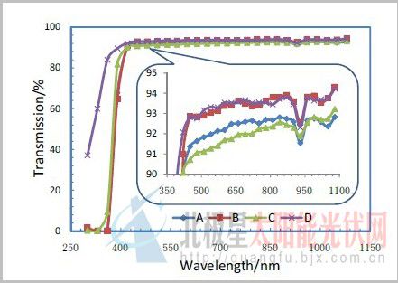光从光伏组件表面到硅体内要依次经过玻璃、密封胶(一般为EVA),所以玻璃和EVA会对光吸收产生影响,玻璃和EVA的透射率越高,组件的封装损失也就越小。常规超白钢化玻璃的透射率为92%左右,目前市场上已推出具有增透膜的镀膜玻璃,透射率可高达96%,镀膜玻璃一般可提高组件1%的输出功率增益,但其长期稳定性和可靠性需要进一步的研究。图2为不同厂家3.2mm布纹钢化玻璃的透射率随波长(波长范围从300nm到1100nm)的变化,其中D样品为镀膜玻璃,其他三种为普通钢化玻璃。从图中可以看出,不同厂家的玻璃的透射率有很大区别,透射率越高则进入到电池中的光也就越多,而电池的输出功率与光强成正比的。在电池和其他辅材不变的情况下,使用透射率高的钢化玻璃,组件的输出功率增大,封装损失减少。