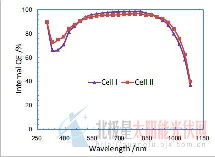 EVA(乙烯-醋酸乙烯聚合脂)用于粘结钢化玻璃、电池和背板,由于它是紫外不稳定的,约占太阳光6%的紫外线长时间的照射可造成EVA胶膜的老化、龟裂、变黄,继而降低其透光率,因此有些厂家的EVA中会添加抗紫外剂,这样就会引起EVA的段波段的透射率的下降。图3为四款不同厂家EVA在交联后投射率曲线图,其中D样品未添加紫外吸收剂,300nm波长的透射率为37.1%,而其他三种加入抗紫外剂的EVA对在360nm波长以下范围内的光是截止的。但现在电池厂家为提高太阳电池的转换效率,开始采用高方阻、密栅的工艺,高方阻电池和常规的P型电池的光谱响应是不相同的,图4显示的是效率相近的常规电池(CellⅠ)和高方阻(CellⅡ)的内量子效率曲线对比图,可以看出,高方阻电池在段波段(<450nm)的IQE是要高于常规电池的,而如果采用对短波长光截止的EVA,则会造成这部分光不能被高方阻电池吸收,那么封装损失肯定比同效率常规电池制作的组件的封装损失要大。因此,使用不同工艺制作的太阳电池需要选择与之相匹配的EVA,在透光率和抗紫外两者之间找到折衷点,在不影响可靠性的基础上降低组件的封装损失。另外,有公司提出使用化学性质稳定、耐紫外、透射率高的透明硅胶作为组件的密封胶,可以有效避免密封胶黄化和电池不能接受到短波长光线的问题。