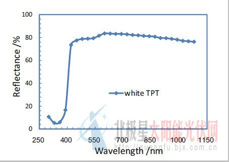 太阳电池组件的背板用来防止水汽进入组件,长采用TPT(Tedler-PET-Tedler)膜。常规白色TPT其与EVA接触面的反射率曲线见图5,可见在中长波具有高达80%左右的反射率。白色的TPT膜对入射到太阳电池间未被电池吸收的太阳光具有反射作用,这部分光在空气与玻璃的界面处被反射向太阳电池,增加入射到太阳电池组件上的光的利用率。一般的,使用白色的TPT比黑色的TPT能增加组件1%的输出功率增益,有利于降低组件的封装损失。