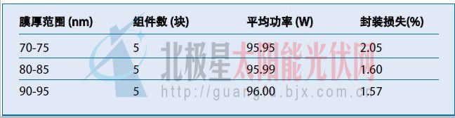 选族三组不同氮化硅膜厚、效率17.25%档的单晶S125-D165(对角线165mm)电池制作组件(板型:4×9=36片串联),在板式PECVD时,调节氮化硅膜后分布为70-75、80-85、90-95(nm),三组电池各制作5块组件,组件对其他辅材相同。组件的理论功率为96.15W,封装结构见表一。