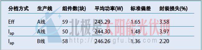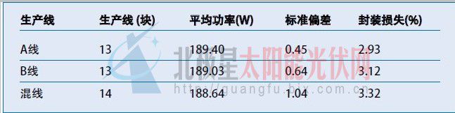 在Eff与Iap分档方式对比实验中,不同生产线生产的电池的封装损失有很大区别,为此我们从两条不同的生产线选取S125电池,分别用单条生产线的电池封装成组件、两条生产线电池相混封装成组件(6×12=72片串联),测试组件功率,计算标准偏差和平均封装损失。电池的效率为17.5%档,组件的理论功率为195.08W。