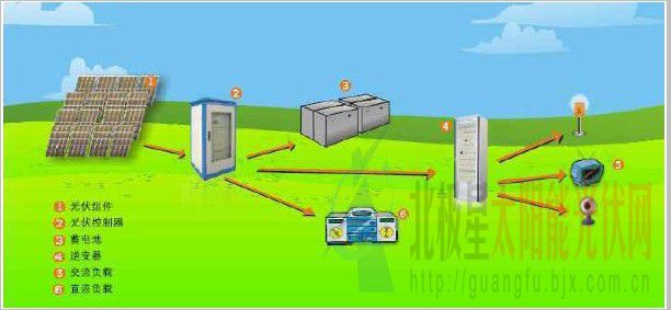 离网型光伏发电系统广泛应用于偏僻山区、无电区、海岛、通讯基站和路灯等应用场所。系统一般由太阳电池组件组成的光伏方阵、太阳能充放电控制器、蓄电池组、离网型逆变器、直流负载和交流负载等构成。光伏方阵在有光照的情况下将太阳能转换为电能,通过太阳能充放电控制器给负载供电,同时给蓄电池组充电;在无光照时,通过太阳能充放电控制器由蓄电池组给直流负载供电,同时蓄电池还要直接给独立逆变器供电,通过独立逆变器逆变成交流电,给交流负载供电。