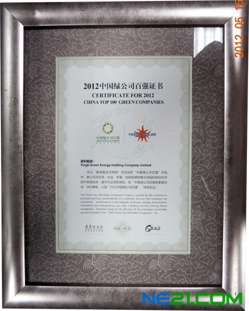 英利集团在经济、社会、环境、创新和透明度五项指标的综合评估中表现优异,居于行业领先地位,经“中国绿公司百强专家委员会”评价审核,入选“2012中国绿公司百强”。 英利集团一直积极践行对于国家、社会的责任感、使命感,这也是获得该奖项的重要因素之一。