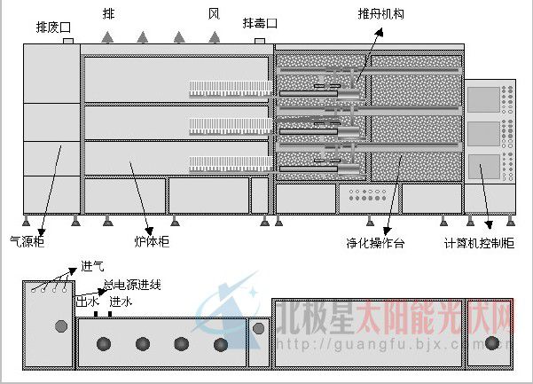 以下以一种太阳电池用扩散炉的结构与操作工艺为例进行说明。该扩散炉的大口径加热炉体选用高品质炉丝以及耐高温保温材料,炉体使用寿命长,保温性能好。温控部分选用带有自整定PID调节系统、0.1级精度及具有多项保护功能的温控仪,因而控温精度高,温度稳定性好,升、降温响应速度快,同时可与计算机通讯实现升降温速率自动控制;送片系统采用丝杠、导轨副配以悬臂式推拉舟机构,可确保进出舟运行平稳,同时能有效地防止因摩擦而产生的粉尘污染。具有完善的安全保护措施,配备了超温、断偶、短路等报警装置。整机由计算机控制,各部分软、硬件连锁,工艺参数的设置及运行均可在触摸屏上直接进行,自动化程度高、操作简便、可靠性高。