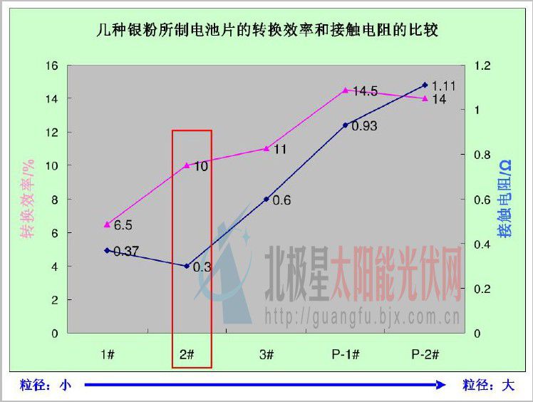 在实际烧结中,炉子温度会产生波动,因此细颗粒如纳米或者接近于纳米粒度范围的银粒子会熔化。因而,银粉在一定的粒度范围内,即在可熔化的粒度范围之上,有利于电池片的转换效率的提高。比较1#银粉和2#银粉可知,虽然粒度分布很接近,但2#银粉比1#银粉的转换效率高而接触电阻却较低,这可以说明在相同的粒度范围内,银粉以亚球形比混合型好。相比P-1#和P-2#银粉,银粉粒度增大,但电池片转换效率反而下降,且接触电阻增大。说明银粉的粒度分布大于纳米范围,较细的颗粒有利于转换效率提高。