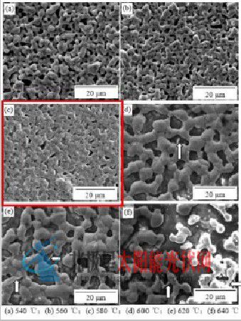 升温速率10℃/min,达到峰值温度后保温5min,根据浆料烧结峰值温度540-640℃,设计了烧结封装温度为540,560,580,600,620和640℃,6组试验方案,烧结成银膜,测得所烧结银膜电阻率如图所示。并对烧结样品做了SEM观察,如图所示。