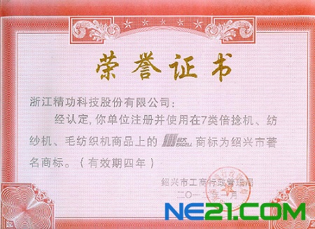 日前,精功科技从绍兴县工商行政管理局柯桥分局拿到了由绍兴市工商行政管理局颁发的“绍兴市著名商标”荣誉证书和牌匾。精功科技公司的注册商标“