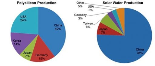 图一、2012年全球多晶硅生产及太阳能硅片生产对比