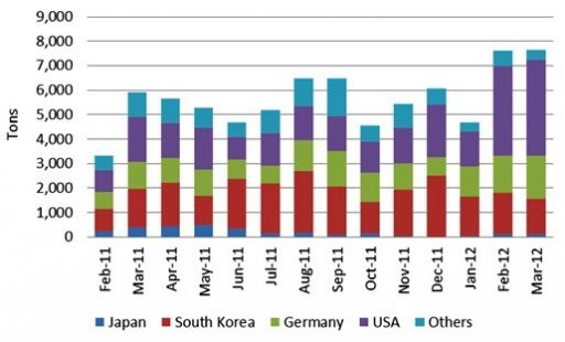 NPDSolarbuzz指出,这种多晶硅生产和需求的区域差异说明,中国是一线多晶硅厂商如Wacker、Hemlock、REC、MEMC、OCI和Tokuyama等最重要的市场。中国进口的海外多晶硅数量每月都在变化,但是如图二所示数量巨大,并呈持续成长趋势。由于美国是仅次于中国的多晶矽生产大国,并且今年产量不断增加,中国每个月从美国进口大量的多晶硅。中国海关资料也显示,来自美国的多晶硅价格自去年年底快速下降,成为最便宜的可靠供应来源。在3月中国进口自美国的多晶硅价格较平均进口价格低每公斤4.4美元。