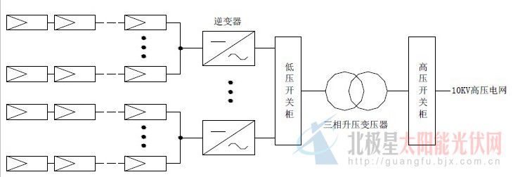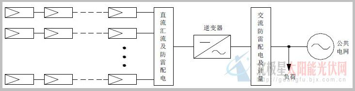 这种并网方式适合于在建筑物上安装朝向相同且规格相同的光伏阵列,在电气设计时,采用单台逆变器集中并网发电方案实现联网功能,如图3所示。