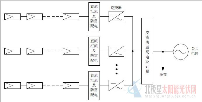 这种并网方式适合于在建筑物上安装不同朝向或不同规格的的光伏阵列,在电气设计时,可将同一朝向且规格相同的光伏阵列通过单台逆变器集中并网发电,采用多台逆变器分布式并网发电方案实现联网功能,如图4所示。