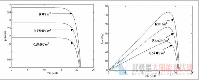 从图5可知,温度上升将使太阳电池开路电压Voc下降,短路电流Isc则轻微增大,总体效果会造成太阳电池的输出功率下降。从图6可知,日照强度在极大的程度上影响太阳电池的输出电流,导致太阳电池输出功率的变化。