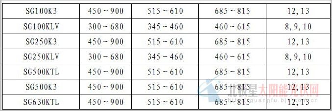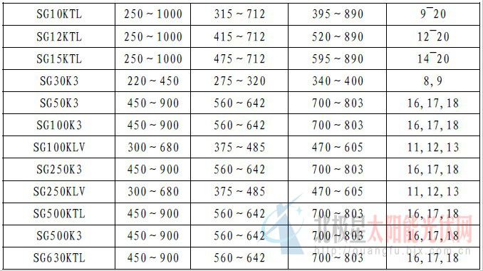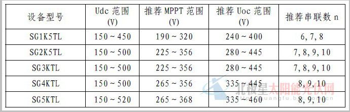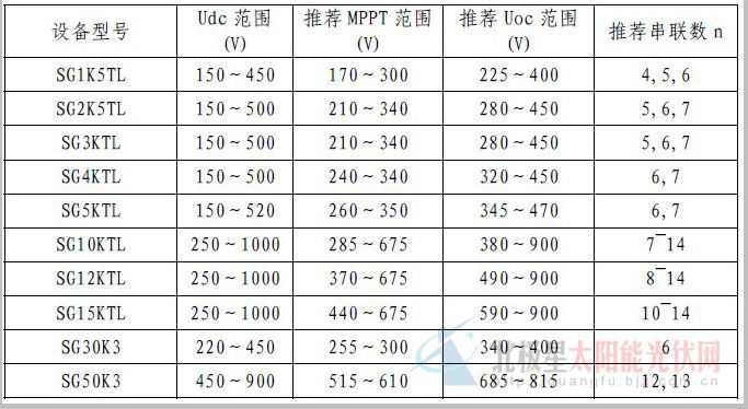 3)针对目前常见的晶体硅光伏组件,结合本公司产品的技术参数,给出各款型号逆变器的推荐Voc和Vmp配置,用户可根据实际光伏组件的参数进行计算和匹配。