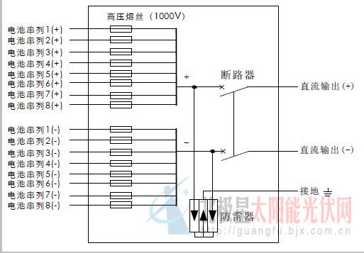 为了减少直流侧电缆的接线数量,提高系统的发电效率,大型的光伏并网发电系统通常需要设计光伏阵列汇流装置,该装置就是将一定数量的电池串列汇流成1路直流输出。
