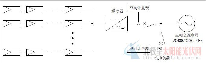 并网系统接入三相400V或单相230V低压配电网,通过交流配电线路给当地负荷供电,剩余的电力馈入公用电网。根据是否允许向公用电网逆向发电来划分,分为可逆流并网系统和不可逆流并网系统。