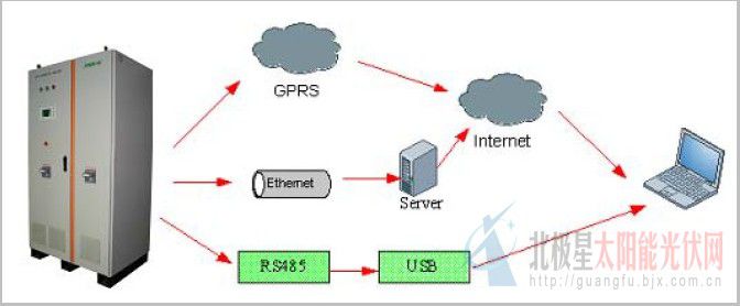 采用RS485/Ethernet/GPRS实现远程通讯功能,通过上位机监控软件,方便直观地监控当前逆变器的运行数据和工作状态,以及历史数据记录和故障信息,同时可和环境监测仪进行实时通讯,了解现场的日照强度、风速、风向和温度等情况。