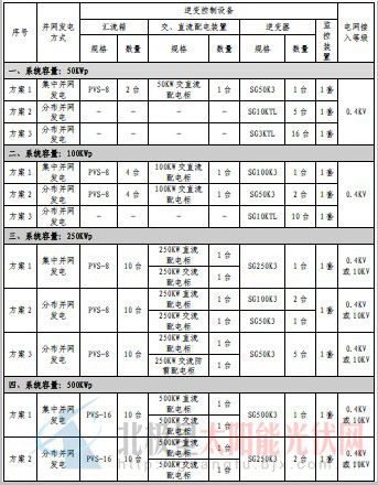 目前,国内的太阳能光电建筑应用系统的规模不一样,从几十千瓦到上兆瓦不等,下表是逆变控制设备的选型方案,供用户选择: