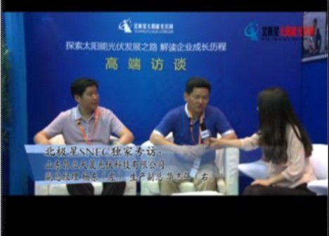 索比光伏网讯:北极星太阳能光伏" title="光伏新闻专题">光伏网上海SNEC太阳能光伏展独家专访山东昂立天晟光伏科技有限公司副总经理杨东和生产副总华志强。