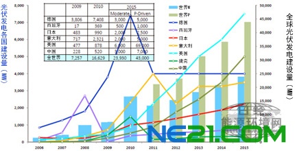 EPIA对2011年到2015年的建设量进行了预测,低增长型预计年增长7.6%,政策指导型预计年增长21.5%。前者为2011年1333万千瓦,2015年2115万千瓦,后者则为2011年2393万千瓦,2015年4390万千瓦。