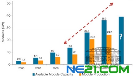 另一方面,以中国企业为主的积极投资还在继续,供应陷于过剩。第一太阳能公司的资料显示,世界的模块产量以8.1吉瓦(2009年)、20.7吉瓦(2010年)、24.2吉瓦(2011年)的速度推移,产能也从13.6吉瓦(2009年)逐渐增加到了26.1吉瓦(2010年)、36.3吉瓦(2011年)(资料3)。