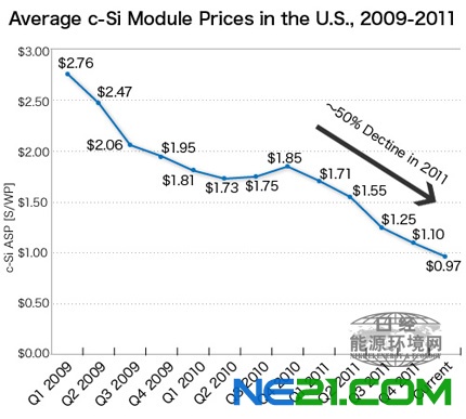 | 资料4.美国的晶体硅模块价格变化(2009~2011) (出处)GTM Research |