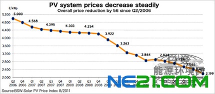 对于上面惊人的数字,大多数看法认为这是收购价格下调前的抢购需求(每半年修改一次收购价格),因为从基本上来说,家庭等建设方已经在电池板的价格大跌中获利。电池板价格下跌的速度要高于收购价格下调的速度。电池板价格在这1年间降到了2分之1,而系统价格在6年间下调了6成(资料5)。