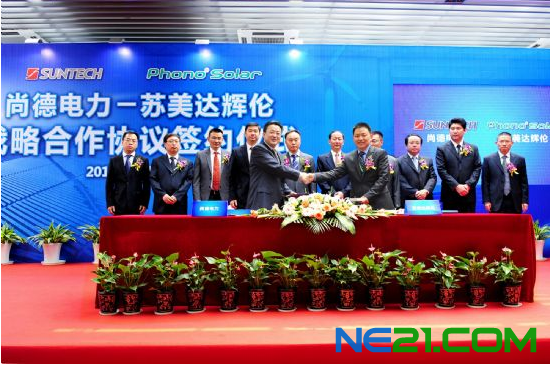 尚德电力副总裁雷霆与苏美达集团副总裁、辉伦太阳能科技有限公司董事长蔡济波代表双方郑重签署战略合作协议。双方将以战略合作协议的签署为良好契机,精诚合作、共享资源,合力开发、投资、建设国内光伏电站工程,共同推动产业升级,努力推进中国光伏产业的健康、快速发展。