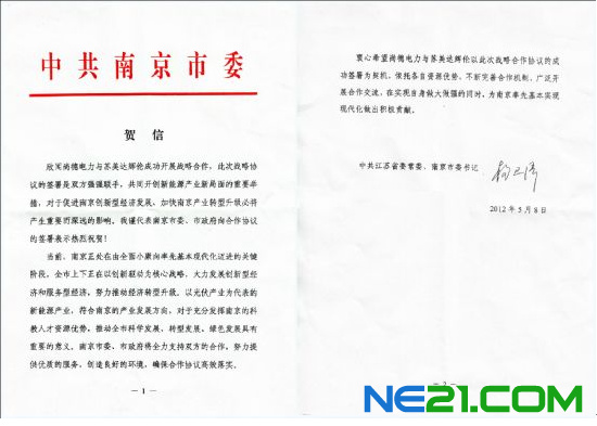 双方签约进行战略合作得到了南京市委的高度重视。江苏省委常委、南京市委书记杨卫泽专门发来贺电表示祝贺。贺电中,杨书记指出,战略合作协议的成功签署是尚德电力与苏美达辉伦强强联手、共同开创新能源产业新局面的重要举措,对于促进南京创新型经济发展和产业转型升级影响深远。以光伏为代表的新能源产业符合南京市的产业发展方向,市委、市政府将全力支持双方在光伏行业开展深度长远合作。希望双方依托各自优势、完善合作机制,广泛开展合作交流,在将自身做大做强的同时,为经济社会发展和南京率先基本实现现代化做出积极贡献!