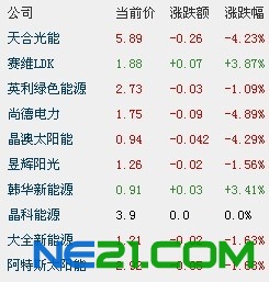 成分股多数下跌,尚德电力跌幅领先,跌幅4.89%;晶澳太阳能跌4.29%;天合光能跌4.23%;赛维LDK逆市涨3.87%;韩华新能源涨3.41%。