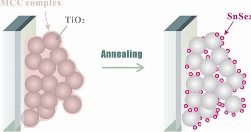 该新方法采用金属硫族络合物(MCC)为前躯体,MCC吸附到二氧化钛(TiO2)纳米颗粒表面后,将TiO2纳米膜进行温和的热处理,MCC分解为量子点并吸附在TiO2纳米颗粒上形成量子点敏化光阳极(图1),制备的量子点和纳晶氧化物表面直接接触,在二氧化钛表面覆盖率高。