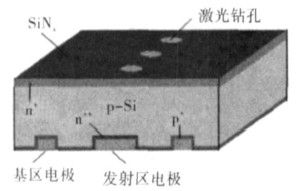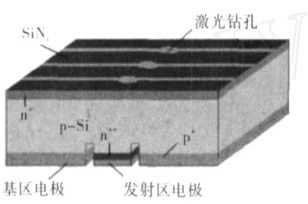 1993年JamesM.Gee研制出EWT(Emitterwrapthrough)电池[16](图6)。EWT电池完全去除了正表面的栅线电极,依靠电池中的无数导电小孔来收集载流子,并传递到背面的发射区电极上。导电孔的制作,早期主要采用光刻和湿法化学腐蚀法,目前最常用的是激光钻孔。孔内进行重磷扩散以降低接触电阻及接触复合。电池背面是间隔排列的p型电极凹槽和n型电极凹槽。分别在n型电极凹槽和p型电极凹槽内进行磷硼扩散以降低接触复合。FraunhoferISE采用SiO2钝化及光刻技术,在Fz2Si衬底上制作出效率为21.4%的EWT电池(6cm2),成为EWT电池的最高效率保持者[14]。Konstanz大学采用丝网印刷技术,在Cz2Si衬底上制作出低成本大面积EWT电池,效率为15.8%[17]。美国AdventSolar公司采用双面收集结结构,并利用激光钻孔及丝网印刷技术,批量生产低成本、大面积(156cm2)的EWT电池,效率均在15%以上[18,19]。