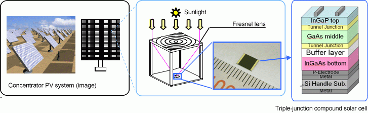 聚光三结化合物太阳能电池的原理与结构图。来源:夏普公司