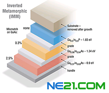 IMM 的能力来自于电池的生长过程——这一技术颠复3 结电池的通常顺序,先沈积顶层,最后是底层。与传统光伏电池不同,IMM 使用了磷化镓铟和砷化镓铟材料。砷化镓外延片上生成电池后,被翻转安装到金属箔片制成的“把手”上,然后移除基板。NREL的研究人员改进了IMM技术,让中间和底层结点产生变形,即“晶格不匹配”,造成的不均匀的原子间距可提高太阳能转换效率。