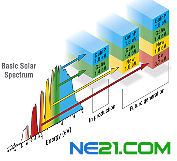 由于磷化镓铟和砷化镓铟将太阳能光谱三等分,便于电池的三个结点吸收,多结太阳能电池的转换效率也远超单结电池。