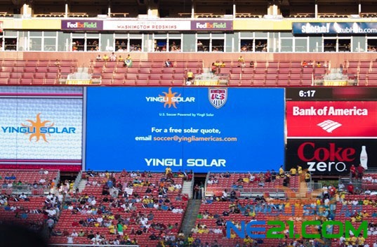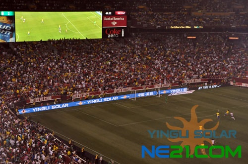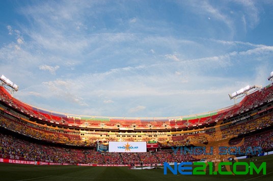 在比赛和中场休息期间,球场两边的巨大屏幕和球场边广告牌不断打出我们英利的LOGO和口号,球场内外到处都洋溢着英利的元素和英利的激情,随着现场观众们山盟海啸般的欢呼,YINGLI SOLAR的光亮照亮了整个华盛顿FedEx球场,英利绿色能源再一次闪耀美国首都华盛顿!
