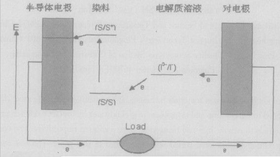 光电转换机理如下:1)太阳光(hν)照射到电池上,基态染料分子(S)吸收太阳光能量被激发,染料分子中的电子受激跃迁到激发态(S3);2)激发态的电子快速注入到TiO2导带中;3)电子在TiO2膜中迅速的传输,在导电基片上富集,通过外电路流向对电极;4)处于氧化态的染料分子(S*)与电解质(I-/I3-)溶液中的电子供体(I-)发生氧化还原反应而回到基态,染料分子得以再生;5)在对电极附近,电解质溶液得到电子而还原(见图1).