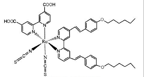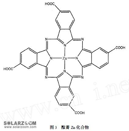 常见的用作敏化剂的染料主要包括:1)羧酸多吡啶钌.这是用得最多的一类染料,它们具有特殊的化学稳定性、突出的氧化还原性质和良好的激发态反应活性,对能量传输和电子传输都具有很强的光敏化作用.目前,使用效果最好的染料为RuL2(SCN)2(L=4,4""-二羧基2,2""-联吡啶)和K-19染料(见图2).2)有机类染料.包括聚甲川染料、酞菁类染料(见图3)、以及一些天然染料,如类胡萝卜素、花青素、紫檀色素等.纯有机染料种类繁多,吸光系数高,成本低,但电池的IPCE和ηsun(总光电转换效率)比较低.3)复合染料.为了最大限度的吸收可见光-近红外光波段的太阳光能,把两种或多种在不同光谱段有敏化优势的染料嫁接在一起,形成的复合染料.4)透明染料.将DSSC太阳能电池板制备成窗玻璃,这是针对DSSC电池实用化开发的新染料.