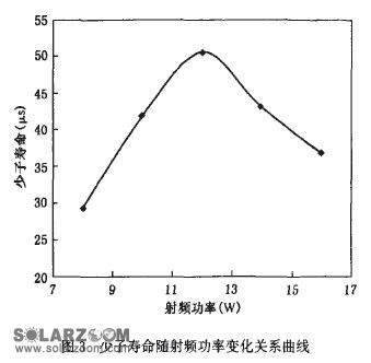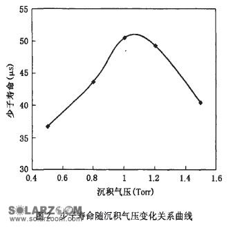 从图2可以看出,少子寿命随沉积气压的增加呈现先增大后减小的趋势,这说明要想得到好的钝化效果,沉积气压必须适中。工作压强从较低值开始上升时,参与反应的气体增加,到达基片表面的反应产物增多,同时压强适当提高,反应室内的等离子体密度增大,反应气体中活性粒子增多,从而得到高沉积速率、高质量的非晶硅薄膜。