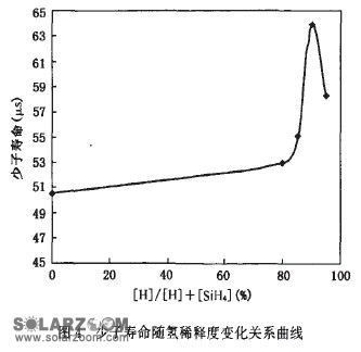 本实验从少子寿命角度出发,研究了氢稀释度对钝化效果的影响。图4为少子寿命随氢稀释度变化关系曲线。从图中可以看出,氢稀释能有效提高少子寿命,但氢稀释度过高反而使少子寿命下降。